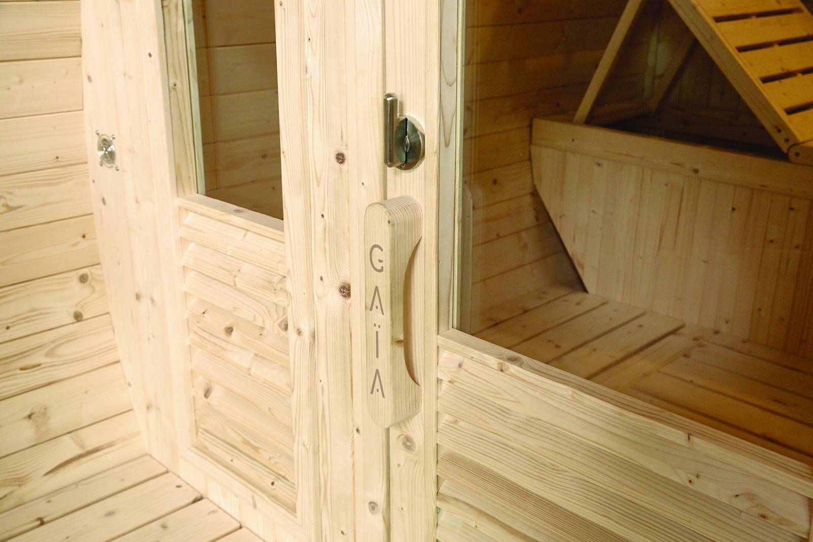Le sauna dispose de banquettes à double hauteur,avec une banquette supérieure multi-positions et un appui-tête amovible pour un confort personnalisé.